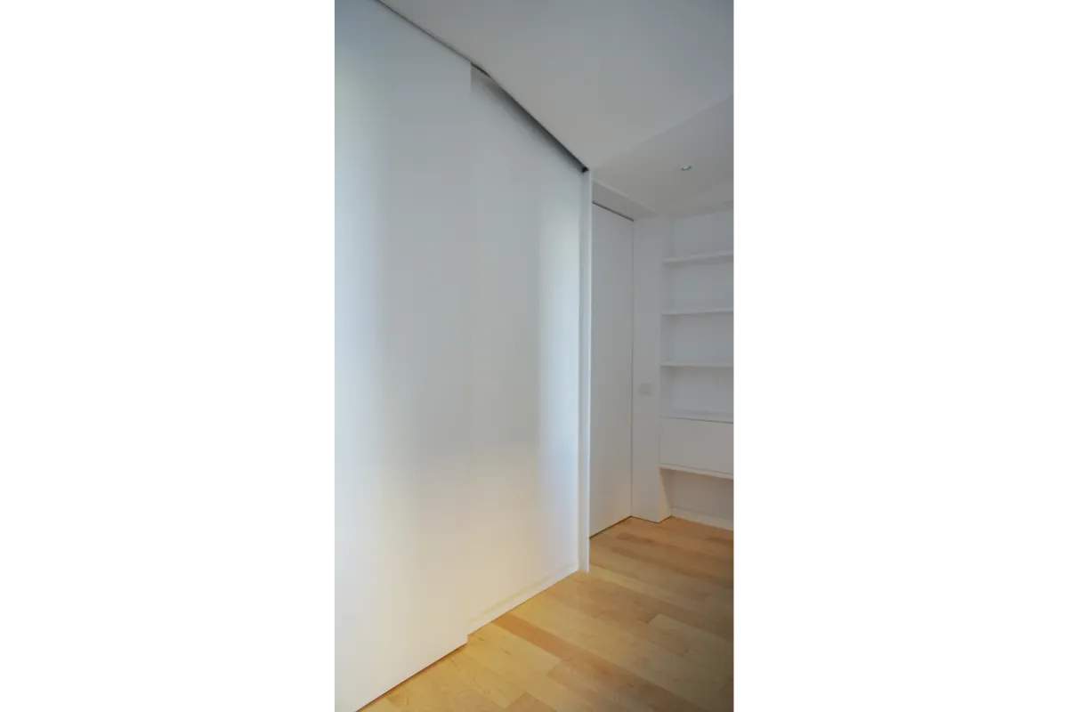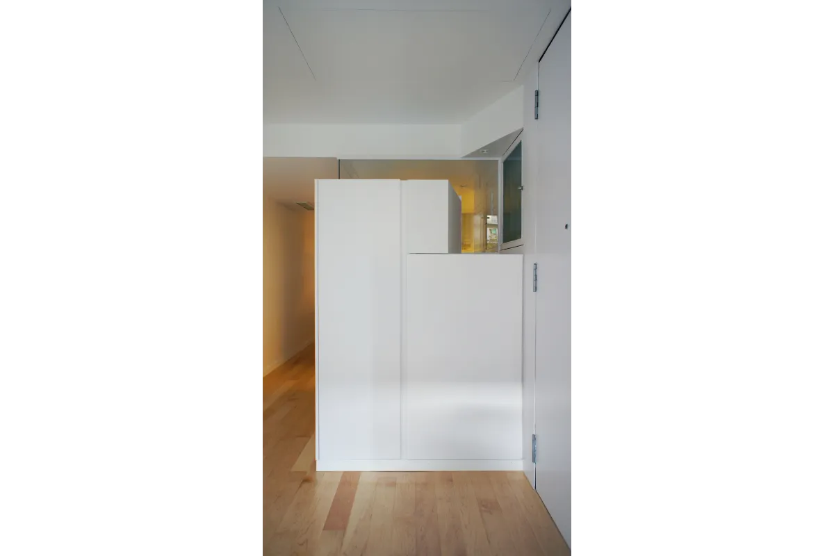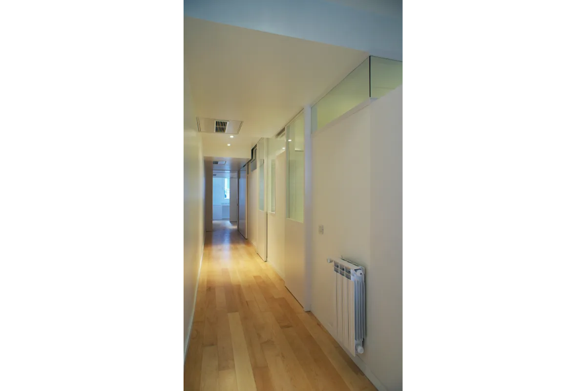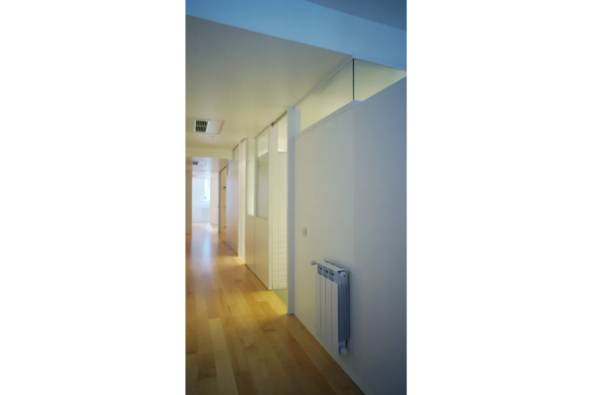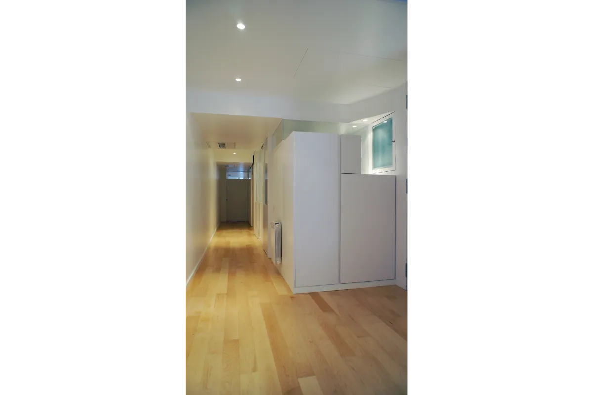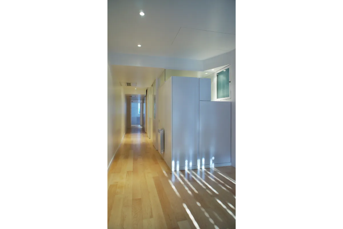 Llevando, interviniendo en sección en el falso techo, las ventanas (en toda su dimensión de altura) hacia el interior. Esta operación provoca unos escalonados en el techo, que unido a que los tabiques no llegan hasta arriba, provoca que la luz pueda ir interfiriendo a lo largo del pasillo creando zonas más y menos iluminadas sobre la biblioteca/pasillo.