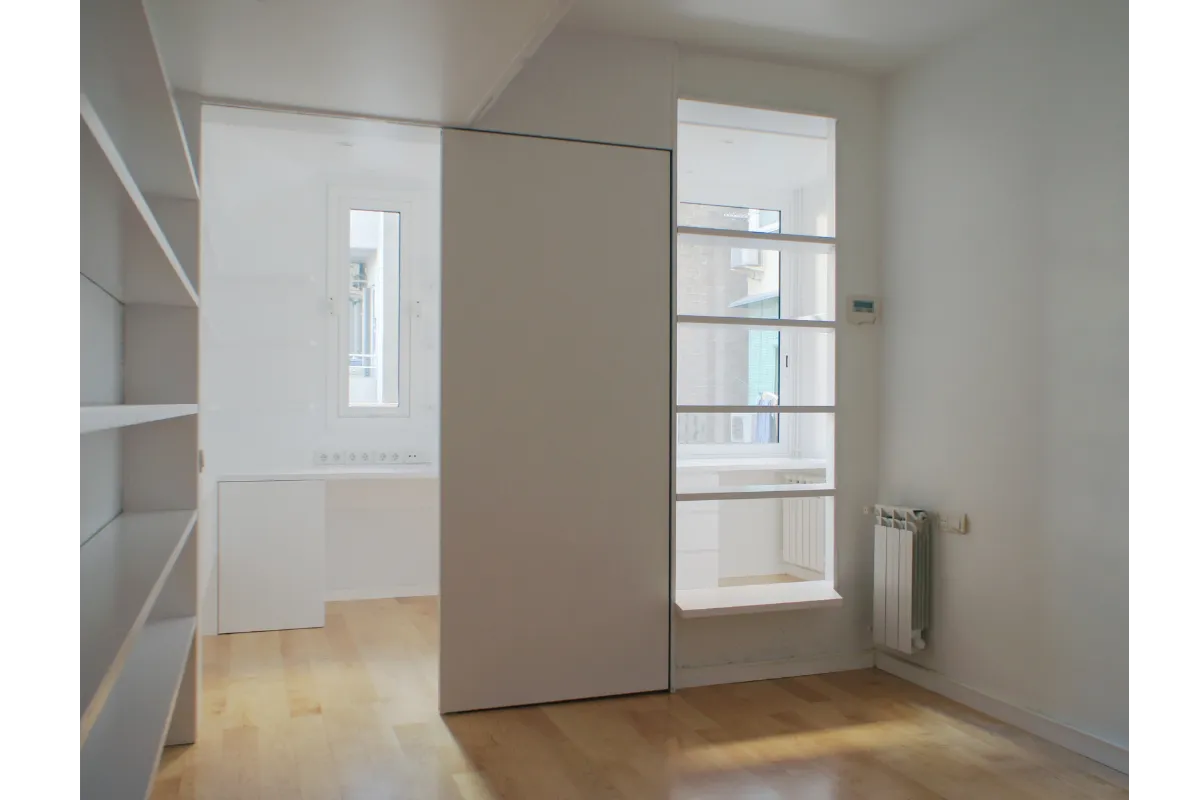 La colocación de una estantería de libros a lo largo de toda la medianera, de forma que se pudieran colocar todos los libros forrando esa larga pared, sirviendo además como aislamiento acústico.