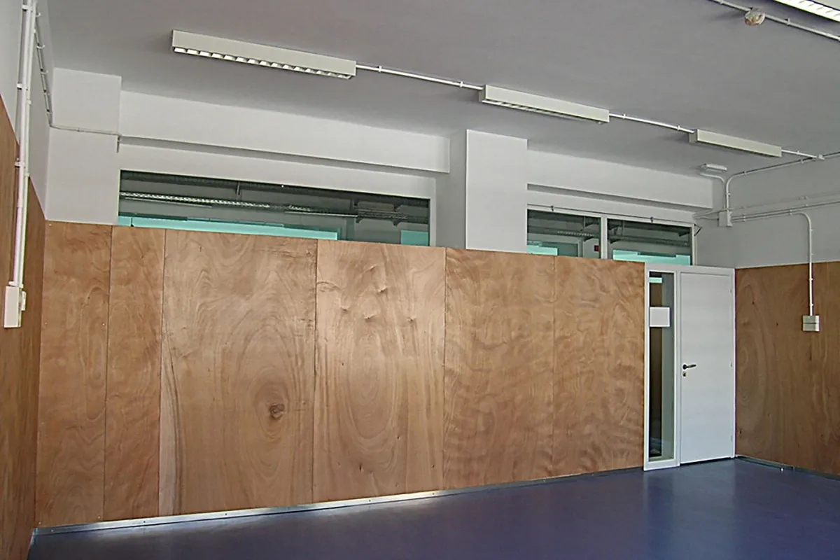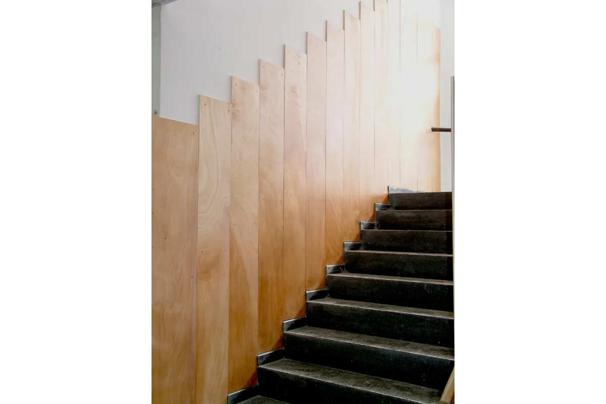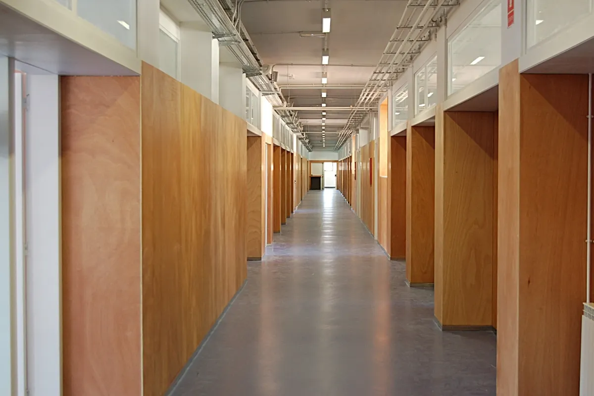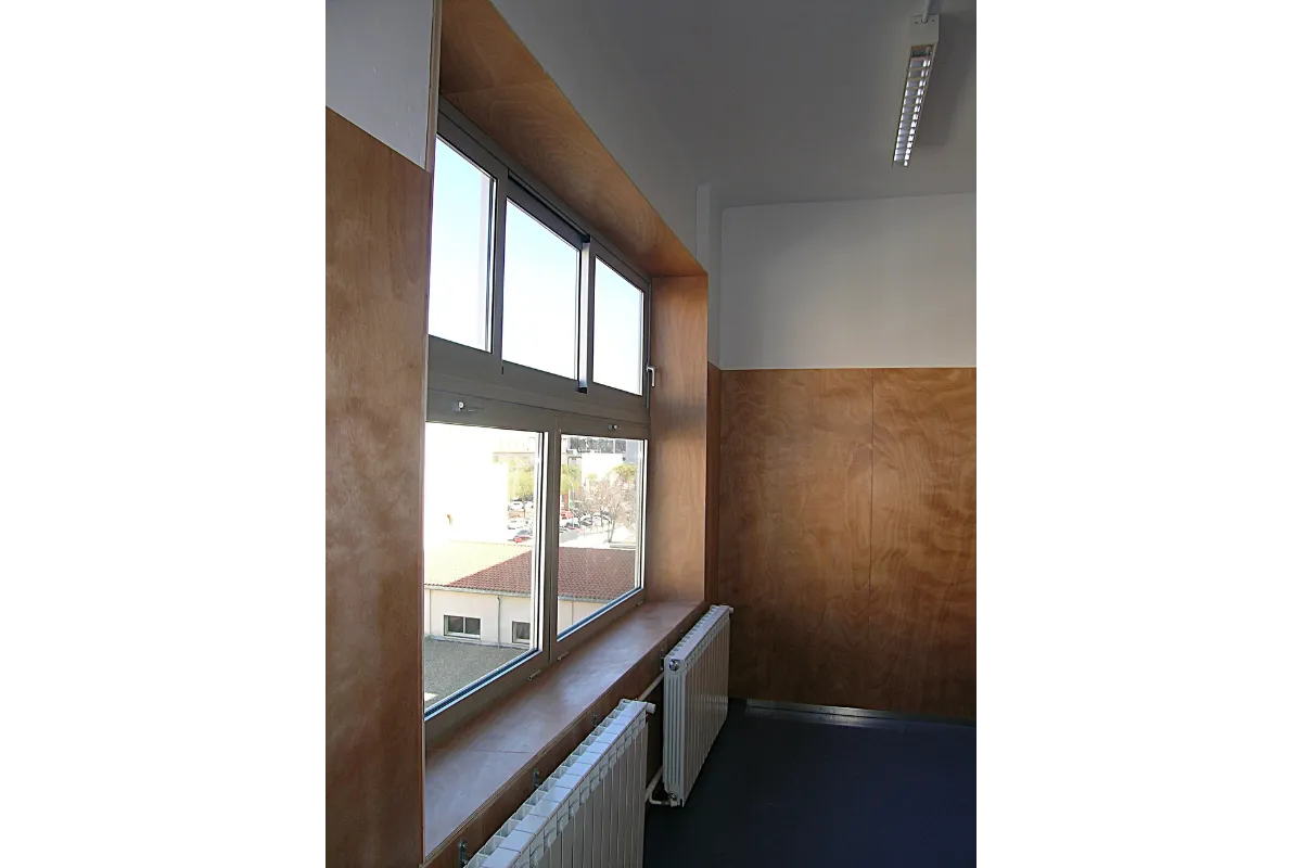De este modo, la operación que se realiza en fachada consta de la re-colocación de las ventanas, poniéndolas en el plano exterior y forrando el hueco con madera, haciendo que la luz que entre en las aulas sea más cálida además de aprovechar y ganar ese pequeño espacio.
